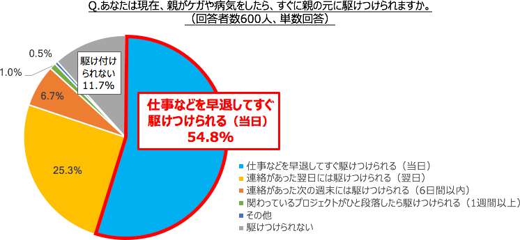 今、親がけがや病気をしたら駆けつけられるか聞いたところ、半数を超す54.8%の人が「仕事などを早退してすぐ駆けつけられる」と回答し、「駆けつけられない」と回答した人は11.7%でした。