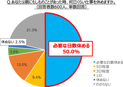 また、親にもしものことがあった時、何日くらい仕事を休めるか、という質問に対しては、半数が「必要な日数休める」(50.0%)と回答し、「休めない」はわずか2.5%でした。