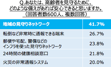 高齢者を見守るために、どのような備えがあれば安心できると思うか聞いたところ、「地域の見守りネットワーク」(41.7%)、「転倒など非常時に通報できる端末」(26.7%)、「郵便や宅配、警備などのインフラを使った見守りネットワーク」(23.8%)の順に多い結果となりました。
