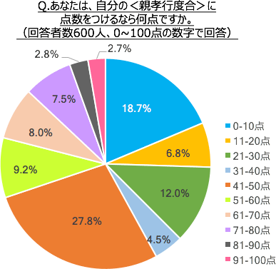 自分の<親孝行度合>を採点してもらったところ、41-50点と回答した人が27.8%と最も多く、平均点は44点でした。