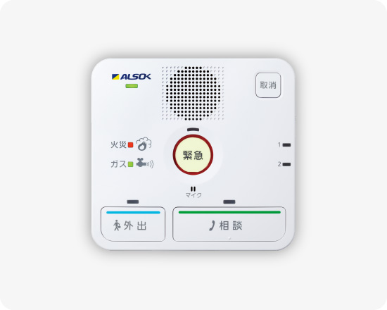 お客様が体調の不良を感じ、誰かの手助けを必要とする場合に、非常押しボタンを押すと訓練を受けたALSOKのガードマンがお客様宅に急行し、必要な対応を行います。必要に応じて救急車の手配や親族への連絡、不在となるお客様宅の戸締りを行う、ご高齢者向け緊急通報サービスです。