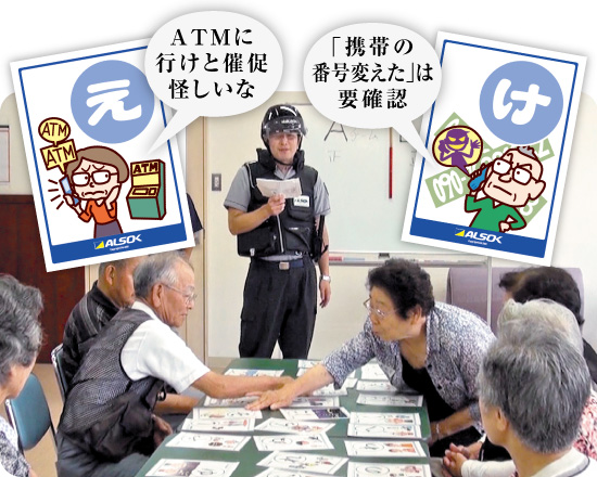 高齢者向け訪問講座「ALSOKほっとライフ講座」を2013年10月より開始しました。当社社員が講師として地域包括支援センター等へ赴き、高齢者を狙った犯罪の傾向と対策について楽しみながら学べる「防犯かるた講座」と「防犯クイズ講座」、または、パートナーに万が一の事があった時に備えるための「救急救命体験講座」を実施します。