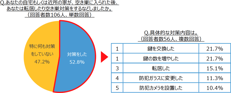 自宅もしくは近所の家が空き巣に入られた経験の有無を聞いたところ、「自宅もしくは近所の家が空き巣に入られたことがある」と回答した人は、17.7%でした。また、空き巣に入られた後に、転居したり、空き巣対策を追加したりしたかを聞いたところ、半数(47.2%)は「対策していない」と回答しました。対策した人の中で最も多かったのは、「鍵を交換した」、「鍵の数を増やした」で、ともに21.7%でした。