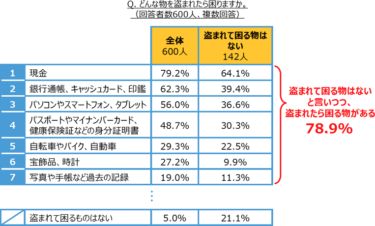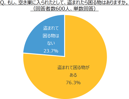 もし、自宅が空き巣に入られたとして、盗まれたら困る物はあるか、という質問では、76.3%は「盗まれて困る物がある」と回答し、4人に1人(23.7%)は、「盗まれて困る物はない」と回答しました。しかし、具体的な物品を提示して、困るかどうか尋ねたところ、「ない」と回答した人のうち78.9%は、盗まれたら困るものがあると回答しました。