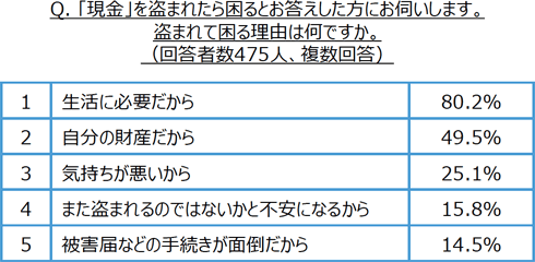 「現金を盗まれたら困る」と回答した人が、困る理由は「生活に必要だから」(80.2%)、「財産だから」(49.5%)に次いで、「気持ち悪いから」(25.1%)の順となりました。