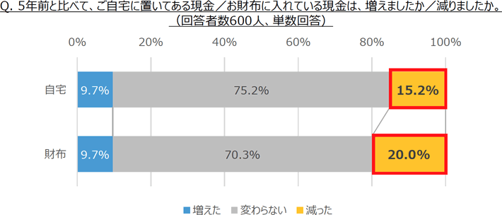 自宅や財布に入れている現金を、5年前と比較すると、「減った」という人が「増えた」人を上回り、特に財布に入れている現金が減った人が多いことが分かりました。