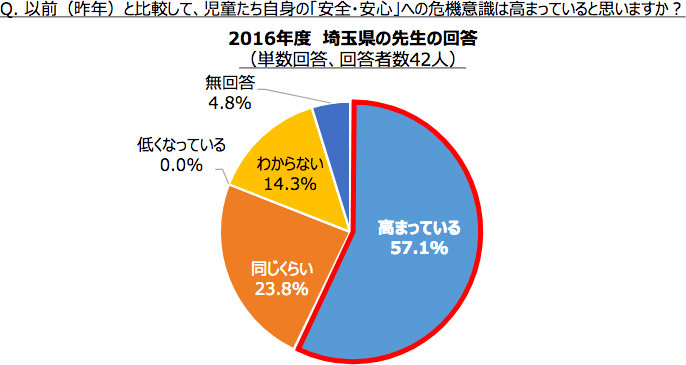 この事件の舞台となった埼玉県に勤務する先生の回答結果を抽出して見てみると、「児童の危機意識が高まっている」と回答した先生の割合が他の地域に比べて2割ほど多くなっていました。