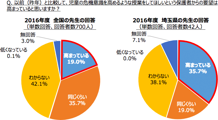 また、「以前(昨年)と比較して、児童の防犯意識を高めるような授業をしてほしいという保護者からの要望は高まっていますか?」という質問に対しても、埼玉県では他の地域に比べて「高まっている」と答えた先生の割合が多くなりました。