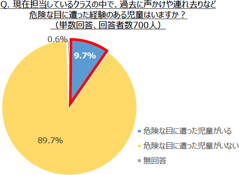 現在担当しているクラスの中で、過去に声かけや連れ去りなど危険な目に遭った経験のある児童の有無について聞いたところ、「過去に危険な目に遭った児童がいる」と回答した先生は、約1割(9.7%)でした。