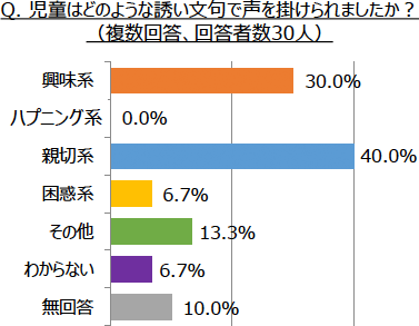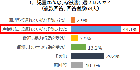 「危険な目に遭った児童がいる」と回答した先生のうち、4割は「声掛けにより連れて行かれそうになった」(44.1%)という事例であり、その声掛けには、「迷子の犬を一緒に探して」「駅まで案内して」など、子どもの親切心につけこむ「親切系」の言葉が使われることが多いようです。