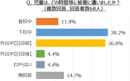 現在担当しているクラスに、危険な目に遭った経験のある児童がいると回答した先生に、被害に遭った時期、時間帯、場所を聞いたところ、時期は、新生活シーズンである「4月から6月」(30.9%)と、夏休みに入る「7月から9月」(26.5%)でした。時間帯別にみると、保護者の「旗振り」など、大人の目が少なくなる「下校中」(38.2%)、「外出中(日没前)」(36.8%)に被害が集中しています。
