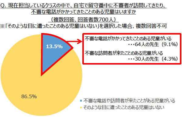 担当しているクラスの中に、過去に留守番中に不審者が訪問してきたり、不審な電話がかかってきたことがある児童の有無を聞いたところ、8人に1人の先生(13.5%)が不審な電話や訪問者が来たことがある児童がいると回答しました。