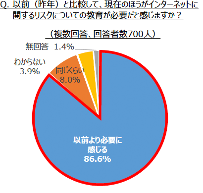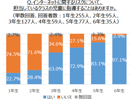 インターネットのリスクについて、以前より教育が必要と感じるか聞いたところ、86.6%の先生が、以前よりインターネットのリスクを子どもに教える必要性を感じていることが分かりました。実際にインターネットのリスク教育をしているのは、学年が上がるほど高い傾向となりましたが、昨年と比べると、低学年で増加している傾向が見てとれました。