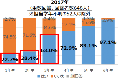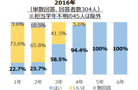 インターネットのリスク教育をすることがあるか質問したところ、低学年では2~3割程度でしたが、3年生になると6割以上に上がり、6年生になるとほぼすべての先生が指導をしていることが分かりました。独立行政法人国立青少年振興機構「青少年の体験活動等に関する実態調査(平成26年度調査)」によれば、小学校2年生で15.5%だった携帯電話またはスマートフォン所持率は、小学校3年生になると27.1%に上昇することがわかりました。親のスマートフォン等を使っている子どもも多いため、インターネットのリスク教育を早くからしたほうがいいと考える先生は多いようです。