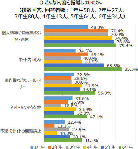 指導している内容は、「個人情報や顔写真の公開・送信」が最も多く、「指導している」と答えた先生のうち7割以上の先生が指導していました。次いで、「ネット内いじめ」「著作権などのルール・マナー」の順となりました。