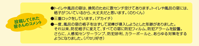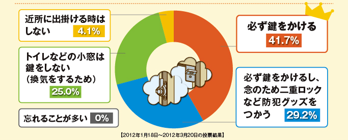 外出する時に家の鍵を閉めるのは当然のことですが、意外にも窓の鍵は換気のために少し開けていたり、閉め忘れていたことで、泥棒に入られてしまうことが多いのです。そこで、外出をする時にきちんと鍵をかけているかのアンケートを行ったところ、窓の鍵を閉め忘れる方はいませんでしたが、トイレなどの小窓は鍵をしないという方が25.0%、近所に出掛ける時は鍵をしないという方も4.1%という結果に。「ちょっとそこまでだから大丈夫だろう」や「こんな小さな窓から侵入されることはないだろう」と油断しているかもしれませんが、プロの泥棒はその油断を見抜いて容易に侵入してきます。一方、必ず鍵を閉めるという方は41.7%、鍵をかけた上で二重ロックなどの防犯グッズを使うという方も29.2%でした。どんな時でも、施錠を心掛けることが大切です。また、窓からの侵入を防ぐグッズもたくさんあるので、是非一度、防犯対策を見直してみましょう。