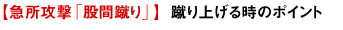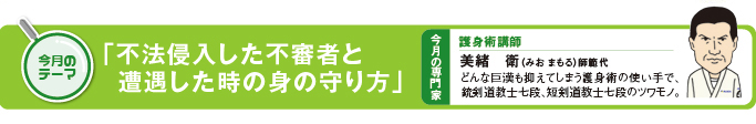もし、犯人と遭遇してしまった場合は、大きな声で助けを呼ぶこと。ホームセキュリティを契約している場合は、非常ボタンを押してすぐに外に飛び出すのじゃ。家人は自分の家から犯人に出て行ってもらいたいという心理が働いて追い出そうとするのだが、自分で説得をしたり、闘おうとするのは非常に危険な行為だ。自分の身を守ることを最優先にして、犯人と直接接触をしないこと。密室の中で、襲われて危害を加えられるなど、手遅れになることも。特に女性は犯人に狙われやすく、強姦の危険もあることを認識しておくのじゃぞ。犯人が凶器などを振りかざしてきたら、素手で対抗するのは無理だ。近くにある物を投げつけて犯人がひるんだ隙に逃げること。最後に、万が一、犯人と接近してしまった時の護身術を教えておこう。それは、急所を攻撃する技。自分の足のスネを相手の急所(股間)に向かって、思いっきり振り子のように振り上げて急所を蹴り上げるのじゃ。