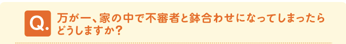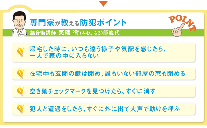 空き巣の場合は、鉢合わせをしないようにするのが一番。ゴミ出しや買い物に行った時など、鍵をかけずにちょっと外出をした時は要注意。さらに、鍵をかけて外出したにもかかわらず玄関の鍵が開いていた時は家に入らず中の様子を必ず確認すること。靴が散乱しているなどちょっとでも普段と違う気配や異常を感じたら、管理人や近所の人、もしくは警察に事情を話して一緒に入ってもらうようにするのじゃ。決して一人で入っていくでないぞ。