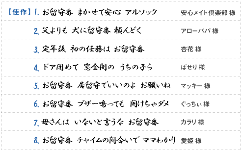 その他にもたくさんの句をいただきました。1番の方(『お留守番 まかせて安心 アルソック』)、大変うれしいです。ありがとうございます!2番(『父よりも 犬に留守番 頼んどく』)と3番(『定年後 初の任務は お留守番』)は、お父さんの家庭での立場を想像して、思わず笑ってしまいました。お父さん、しっかりお留守番してください!そして娘さんと奥さん、たまに はお父さんと一緒に出かけてあげてくださいね(笑)。4番(『ドア閉めて 窓全開の うちの子ら』)は、よくあるケースです。子どもは、テレビゲームなど楽しいことがあるとそちらに夢中になり、他のことは忘れてしまいがちですので、注意が 必要です。