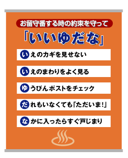 皆さんは、優秀賞の句に出てくる「いいゆだな」ってご存じですか? これはALSOKが小学校で行っている防犯授業「あんしん教室」の、「安心してお留守番」編で教えている、留守番前に気をつける5つのポイントの頭文字を取ったものです。(1)「いえのカギを見せない」は、家の鍵を犯人に見せて留守宅に帰ると悟られないようにする、(2)「いえのまわりをよく見る」は、家に入るときに後をつけて侵入する人がいないかよく確認する、(3)「ゆうびんポストをチェック」は、留守だと思われたり個人情報が流出したりするのを避けるために郵便物を確認する、(4)「だれもいなくても『ただいま!』」は、近くに潜んでいるかもしれない犯人に対して家の中に人がいると思わせる、(5)「なかに入ったらすぐ戸じまり」は、防犯の基本である戸締まりをしっかりする、という安心してお留守番するための約束事をまとめています。