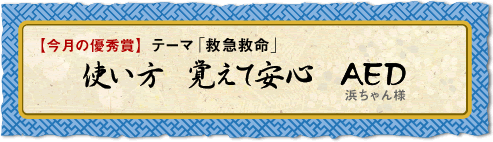「AED」は日本語で“自動体外式除細動器”といい、突然の心臓発作などで心臓が正常に動かなくなった人に電気ショックを与え、心臓を正常な動きに取り戻すための救命機器です。優秀賞の句のように使い方を覚えれば、目の前の人が突然倒れたときに命を救うことができるかもしれません。「AED」は、電極パッドを胸に貼り電流を流すというのが、基本的な使い方です。音声ガイダンスに従って操作をすればいいのですが、事前に講習を受けておけば安心ですね。消防署で実施している救命講習などに、ぜひ参加してみてください。