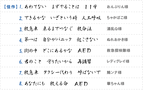 最後に8番(あなたにも 救える命 AED)。「AED」のおかげで、一般の人でも救命機器を扱うことができるようになりました。いざ現場に居合わせた時は、あわてずに対処できるよう、救急救命に対する意識を高めておきたいですね。