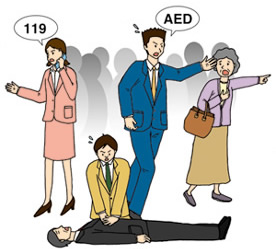 「AED」は、人が集まる駅や施設に設置してあり、心臓発作などで倒れた人の心臓に電気ショックを与え、心臓の動きを正常に取り戻す機能を持った救命機器です。音声ガイダンスに従えば、誰にでも扱うことができるようになっています。
