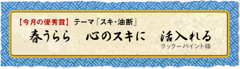 まずは優秀賞の句。春の陽気で緩んだ心のスキ・油断に入り込もうとする悪者から自身を守るため、この句のように「活!」を入れる必要がありますぞ!「活」を入れるといっても、体に“気”を入れ、平常心を保つこととお考えくだされ。それには「呼吸」することがとても効果的。まず「吐いて」から「吸う」。溜まったものをすべて吐き出してから新鮮な空気を吸うというイメージですな。
