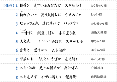 佳作の1番(携帯を 見ているあなたは スキだらけ)の句。どこでも使えて便利な携帯電話も、使用中はスキだらけと自覚せよ!使うときはなるべく壁を背にし、姿勢良く顔を前に向けながら、回りに気を配られよ。加えて2番(掏(す)りたいと 思う気持ちに させぬこと)。ズボンの後ろポケットに入れた長財布は「掏(す)ってくれ」と言っているようなもの。ズボンのポケットに入れるなら前側に、鞄の中ならベルトをたすきがけにして前に持つこと。続いて3番(ビュッフェ式 席に戻れば バッグなし)の句。心当たりのある方も多いと思うが、バックを置きっぱなしにするなど言語道断。常に体から離してはなりませんぞ。荷物が多い場合は、事前にクロークに預けておくべし。料理を食べることに気を取られてお財布まで取られてしまっては、元も子もないですぞ。