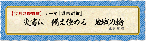 佳作の1番(我が家用 みんなで話す 危機管理)の句。災害発生時、家族が別々の場所にいる場合も考えられますので、連絡方法や集合場所について事前に話し合っておく必要があります。いまや家族同士の連絡手段として欠かせない携帯電話も、災害時は不通になる恐れがありますので、災害用伝言ダイヤルの利用や、遠方の親戚宅を共通の連絡先にしておくなど、他の手段を決めておきましょう。次に2番(いざ災害 防災キット きっといる)の句。被害状況によっては救援物資が届くまで1〜3日かかります。そのため、水や食料などが入った非常袋は常備しておきましょう。3番(非常食 味が良すぎて 日常化)。確かに、最近の非常食はおいしいものが増えています。非常食が日常化してしまうのは困りますが(笑)、賞味期限前に家族で試食してみるのはおすすめです。4番(風呂の湯が トイレで流す 水になる)も注目です。お風呂の水はトイレや消火活動で使うなど、災害時にも役立ちますね。