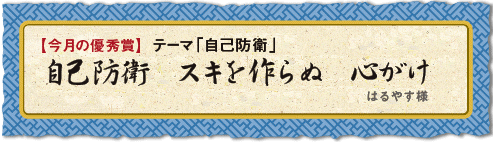 そして最後は、10番(手を洗い こまめにうがい 自己予防)の句。これは健康面の自己防衛。寒く乾燥する冬は、特にウィルスに気をつけなければなりませんな。それがしも毎日こまめな手洗い・うがいを心がけておりますぞ。諸君もご自愛のほどを!