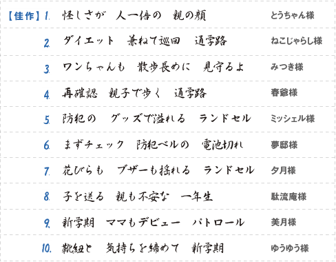 新学期が始まると、1番(怪しさが 人一倍の 親の顔)のようになってしまう方もいるのではないでしょうか(笑)。登下校する我が子が心配で凝視するあまり、まわりから不審者と間違えられることのないよう、笑顔で挨拶しながら見守りましょう。次は、親御さんに限らず誰にでもできる2番(ダイエット 兼ねて巡回 通学路)と3番(ワンちゃんも 散歩長めに 見守るよ)。散歩などのついでに行なうことで、気負わず長く続けることができますね。巡回の時間は、登下校の時間帯に合わせて朝8時と午後3時頃にお願いします!