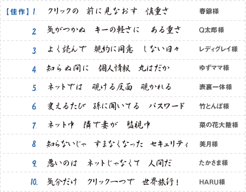 このように、インターネットの普及は老若男女を問いません。まさに8番(知らないじゃ すまなくなった セキュリティ)の時代です。昨今、インターネットの危険性が問われますが、どのように使うかは、その人自身の問題です。そのため9番(悪いのは ネットじゃなくて 人間だ)の通りなのです。本来インターネットは、10番(気分だけ クリック一つで 世界旅行!)のように夢のある使い方ができるもの。その良さを最大限に活かすために、インターネットにはどんな危険があるかをしっかり認識し、対処をすることが大切です。「まさか自分が…」と思わず、お家のネット環境の見直しと、それを使う家族のルールを話し合ってみてはいかがでしょうか。